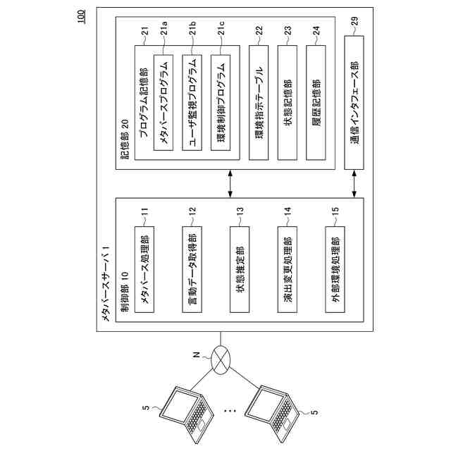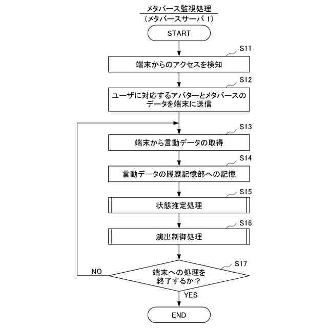 【解決手段】メタバースサーバ1は、複数のユーザの各々に対応するアバターが活動するメタバースにおけるアバターの言動データを取得する言動データ取得部12と、言動データ取得部12が取得した言動データに基づきアバターに対応するユーザの状態を推定する状態推定部13と、状態推定部13が推定した状態に応じてユーザに提示するメタバースの演出を変更する演出変更処理部14と、を備える。