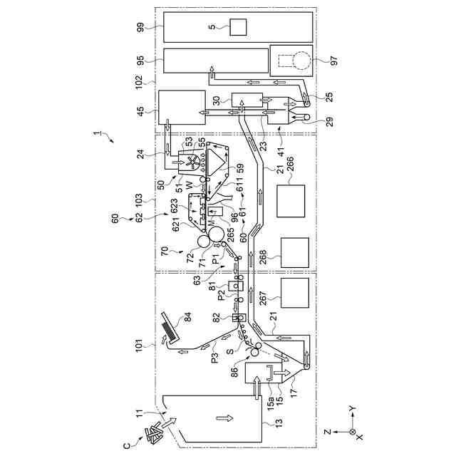 図1に示すように、本実施形態に係るシート製造装置1は、第1ユニット群101、第2ユニット群102、および第3ユニット群103を備える。第1ユニット群101、第2ユニット群102、および第3ユニット群103は、図示しないフレームに支持される。図1においては、紙片C、シートP3、スリット片S、および不要な端材などが移動する方向を白抜きの矢印で示している。以下の説明では、複数の紙片Cから成る紙片Cの集合体も単に紙片Cという。