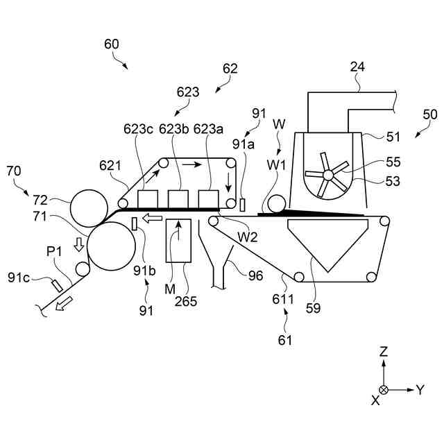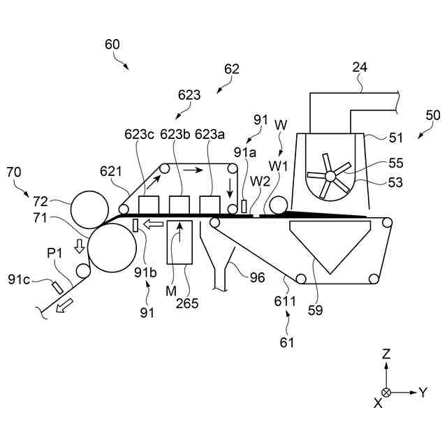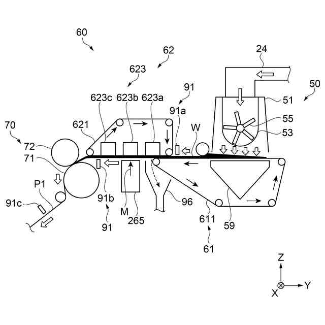 以下の各図においては、相互に直交する座標軸としてXYZ軸を付し、各矢印が指す方向を+方向とし、+方向と反対の方向を-方向とする。Z軸は鉛直方向に沿う仮想軸であって+Z方向を上方とし、-Z方向を下方とする。-Z方向は鉛直方向である。また、シート製造装置1において、材料、ウェブ、およびシートなどの搬送方向の先を下流とし、搬送方向を遡る側を上流とする。図示の便宜上、各部材の大きさを実際とは異ならせている。