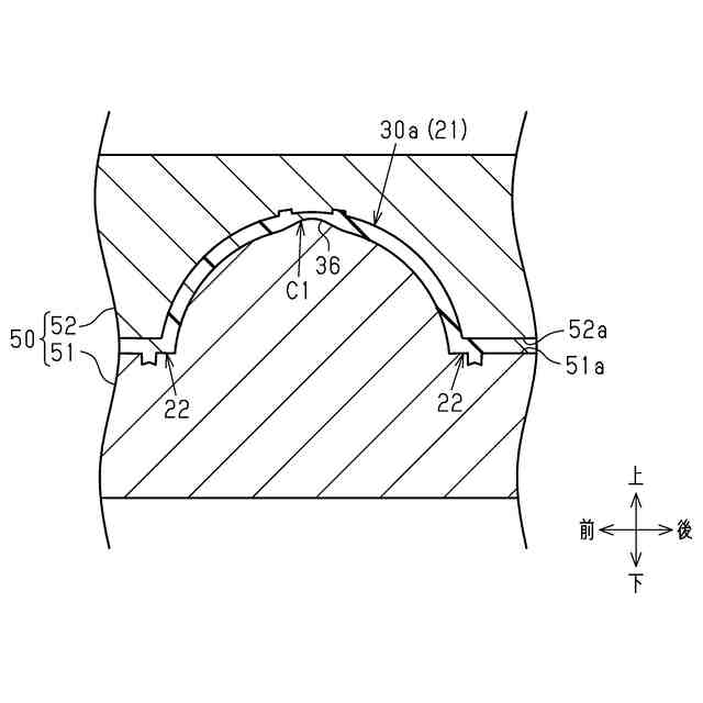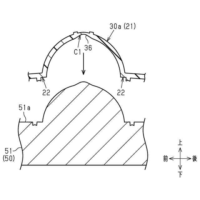 すなわち、円筒状のリンフォースメントメンバーを周方向に分割すると、各分割体の断面形状は弧状に湾曲した形状となる。このため、樹脂材料により成形された各分割体が成形型から取り出された後、冷却されると、各分割体には、周方向における中央部を中心に、周方向における端部同士が互いに近づくような変形が生じやすい。その結果、リンフォースメントメンバーを形成する際に、複数の分割体同士の接合箇所の位置ずれが生じることで、分割体同士の組付けが困難となるおそれがある。