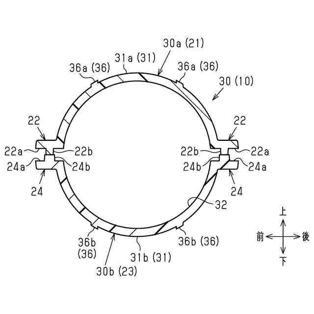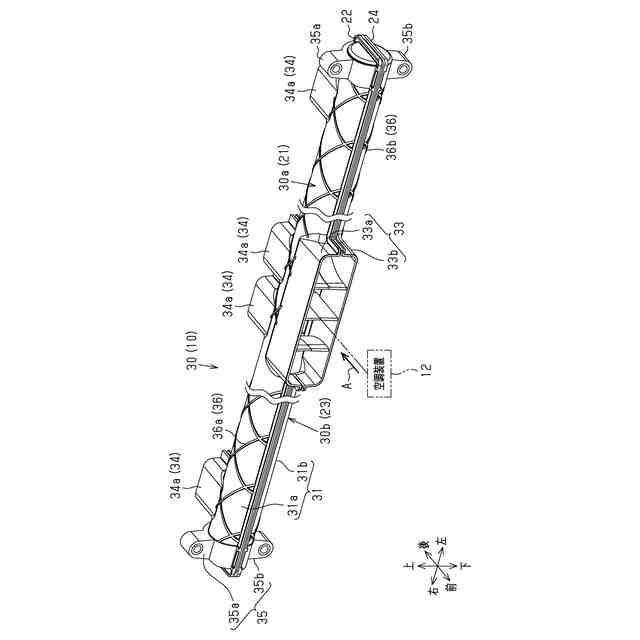 ビーム本体の外周面には、外方へ延びる格子状のリブ部が形成されている。格子状のリブ部は、各分割部材と一体に成形されている。