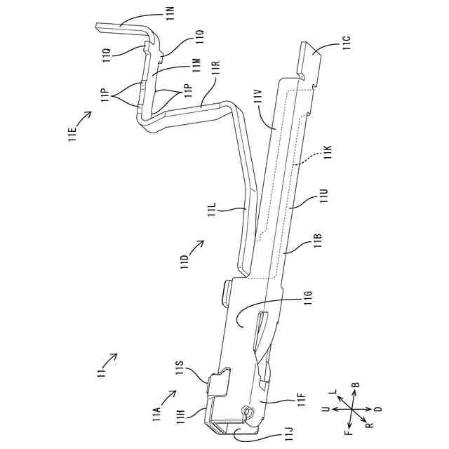 図5は、端子金具がキャリアにつながり展開された状態、及び曲げ加工が終了しキャリアにつながった端子金具を示す斜視図である。