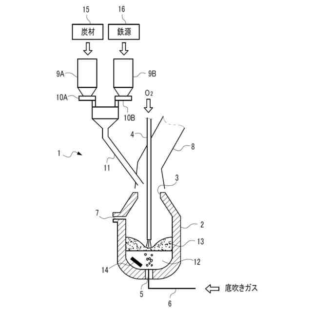 ところで、鉄スクラップを用いて溶融鉄を製造する精錬装置として、従来、一般的にアーク炉が使用されていた。しかし、従来のアーク炉の場合は、鉄スクラップの溶解に多くの電力を消費することから、我が国のように電力価格が高い場合には、製造コストが高くなる。そこで、アーク炉を使用することなく鉄スクラップを経済的に溶解する方法として、酸素ガス供給能力の高い転炉型精錬炉を用い、安価な炭材を酸素ガスで燃焼させ、炭材の燃焼熱を熱源として鉄スクラップを溶解し、溶融鉄を製造する方法が提案されている。