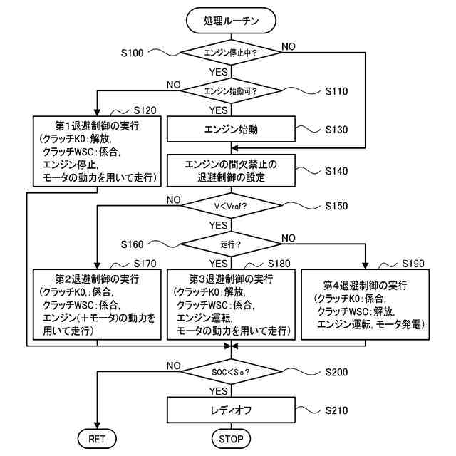こうしたハイブリッド車において、低速段異常が生じているときに車速が低い場合、変速機において形成可能なギヤ段を形成すると共に第2クラッチをスリップ係合状態としてエンジン(必要に応じて更にモータ)からの動力を用いて退避走行を行なうと、第2クラッチの差回転による発熱が懸念される。これに対して、エンジンを停止すると共に第1クラッチを解放状態とすると共に第2クラッチを完全係合状態としてモータからの動力だけを用いて退避走行を行なうことが考えられるものの、車速が所定車速以上に至ったときに、モータによるエンジンのクランキングを伴ってエンジンを始動する必要があり、モータの電力消費により車両の航続可能距離が短くなる可能性がある。本開示のハイブリッド車は、低速段異常が生じているときに、車両の航続可能距離が短くなるのを抑制することを主目的とする。