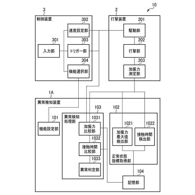 状態が未知である前記打撃装置を前記打撃試験対象へ前記衝突速度で打撃させて得られた接触時間と、正常な状態の前記接触時間の統計量との差分、および、状態が未知である前記打撃装置を前記打撃試験対象へ前記衝突速度で打撃させて得られた加振信号の最大値と、正常な状態の前記加振信号の最大値の統計量との差分、のいずれか一方または両方に基づいて、前記打撃装置の異常を検知する異常検知部と、