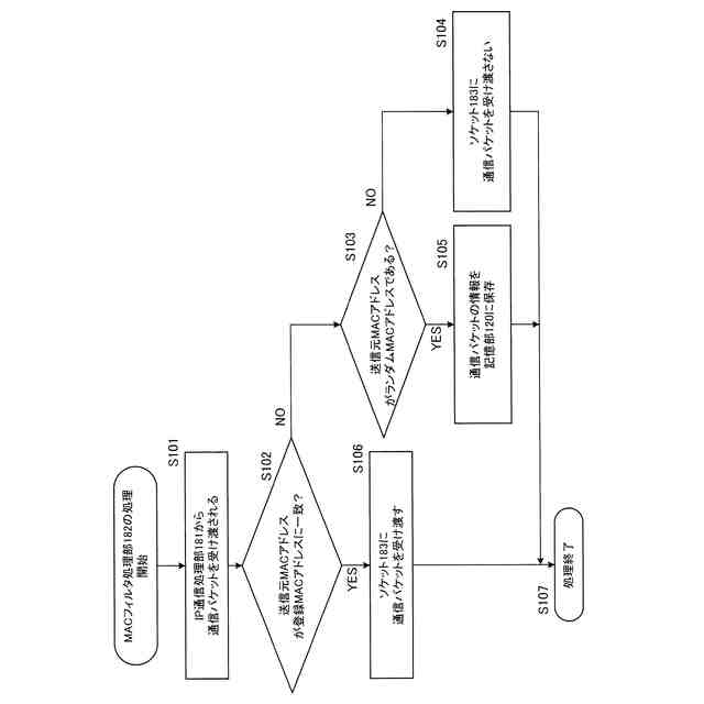 実施の形態2に係る画像形成装置(通信装置)において、MACフィルタ処理部によって実行される処理(IP通信処理部が通信パケットをMACフィルタ処理部に受け渡したときの処理)を示すフローチャートである。
