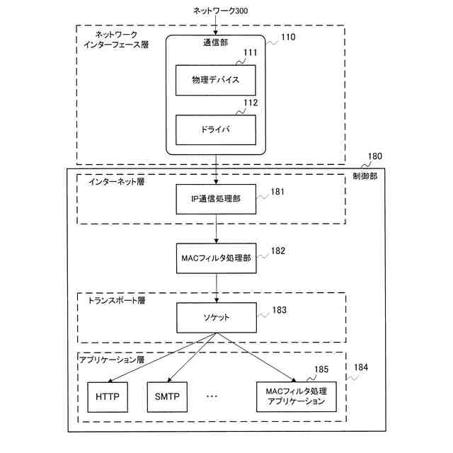 前記ネットワークを介して受信した通信パケットに含まれる送信元の通信機器のMACアドレスが前記登録MACアドレスと一致する場合に、前記送信元の通信機器との通信を許可する制御部と、