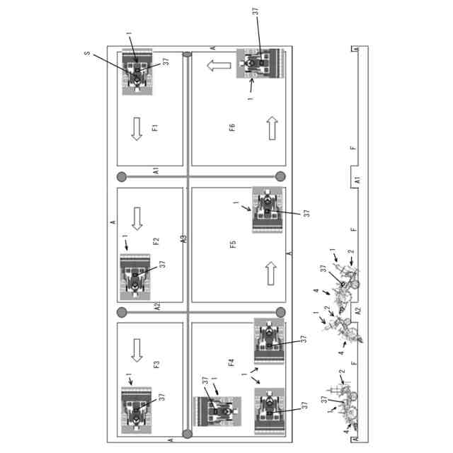 請求項2記載の発明は、圃場F1~F6のティーチング工程の2辺目で畦越え地点を登録しない場合は3辺目のティーチング工程終了時に自動モードに移行可で、ティーチング工程の2辺目で畦越え地点を登録した場合は3辺目のティーチング工程終了時に自動モードに移行不可で4辺目のティーチング工程終了時に自動モードに移行可とし、3辺目のティーチング工程終了時に自動モードの移行可否を報知する請求項1記載の乗用型苗植機である。