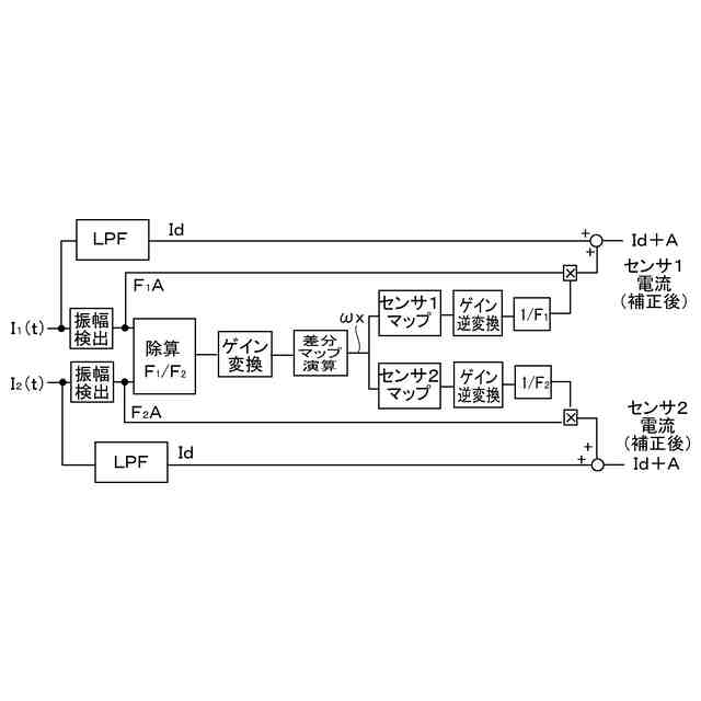 (ω)は、それぞれのセンサに於ける表皮効果によって決定されるので、交流成分の角周波数ω(=2πf[fは、周波数])の関数である。かくして、上記の構成に於いて、「前記第一及び第二の電流センサの各々の検出値から交流成分を抽出する手段」は、任意の手法にて、式(2a)、(2b)に於ける交流成分F