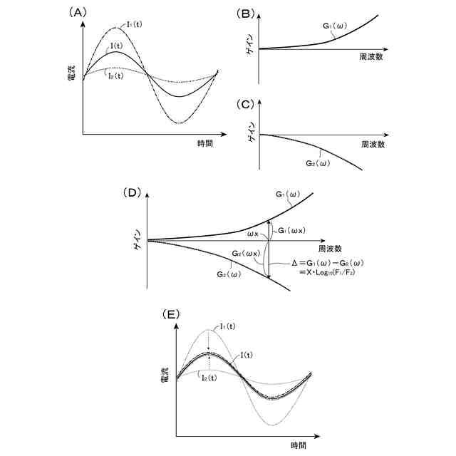 ここで、tは、時間であり、Aは、交流成分の振幅であり、ωは、交流成分の角周波数である。そして、第一及び第二の電流センサは、上記の如く、互いに交流成分の検出ゲインが異なるところ、交流成分の入力に対する出力の比を、それぞれ、F