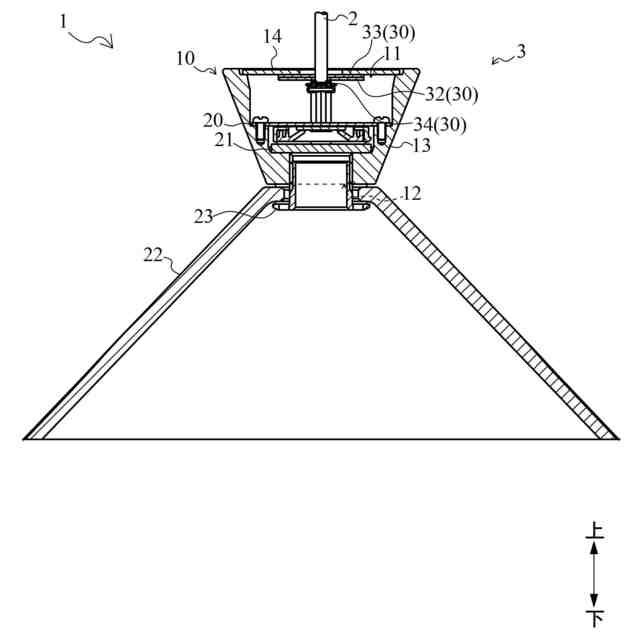 従来、灯具と、天井面から前記灯具を吊り下げる吊り下げ部材と、を備える、照明器具の技術は公知となっている。