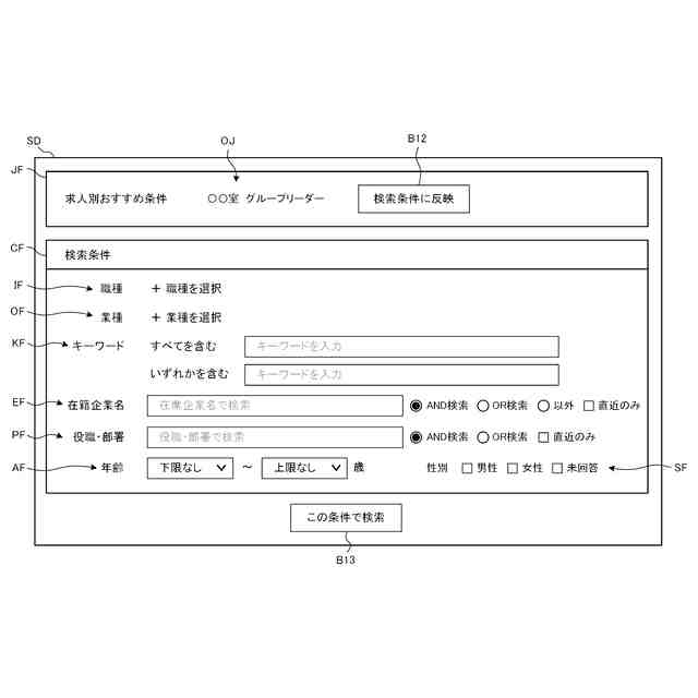 推奨条件が検索条件として設定された状態の求職者検索画面SDの一例を示す図である。
