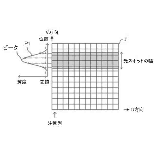 多重反射によるノイズは、受光画像単位で発生し、観察される。特許文献1で開示される光学式変位計は、X方向(スリット光が延びる方向で)に対応するU方向のピーク候補間の位置関係に基づいて、真のピーク位置と多重反射によるノイズとを受光画像1枚それ自体で区別する。