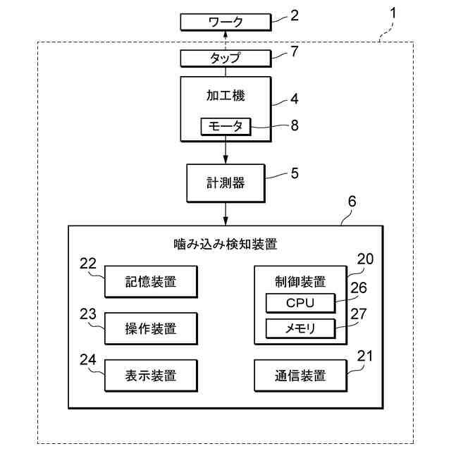 【解決手段】ワーク2を加工する回転工具としてのタップ7の噛み込みを検知する噛み込み検知装置6であって、回転工具を駆動するモータ8の動作状態に関するパラメータの時系列の波形データを取得する取得部と、波形データから、パラメータの値が、回転工具による加工時のパラメータの値の上限値及び下限値として予め設定された所定範囲内となる部分波形データを抽出する抽出部と、抽出部で抽出した部分波形データの内、時間幅が所定値以上の部分波形データを選定する選定部と、選定された部分波形データにより、回転工具の噛み込みを検知する検知部と、を備える。