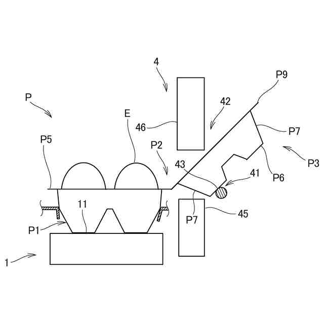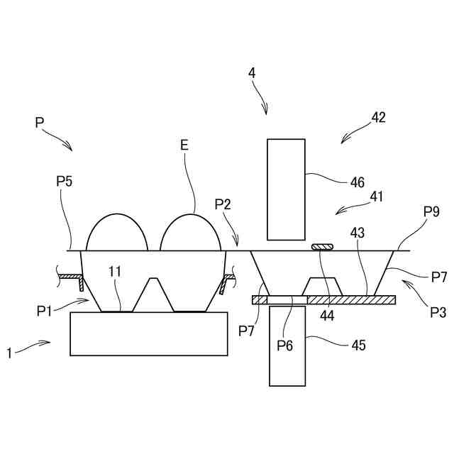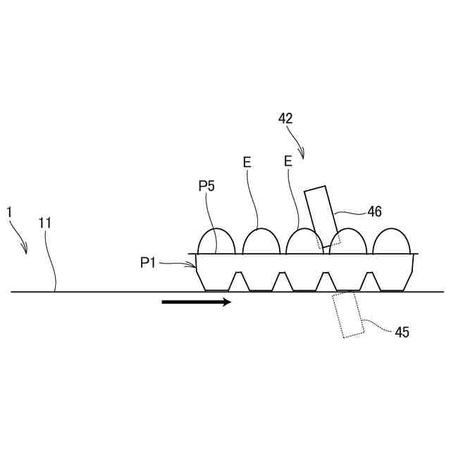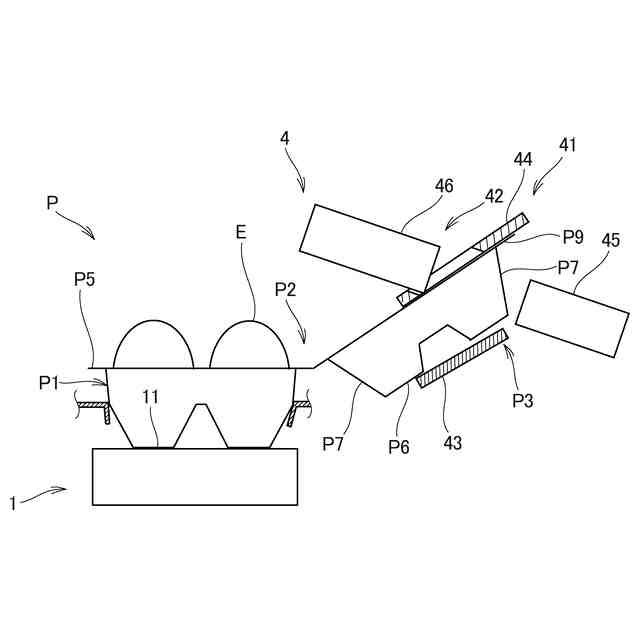 以下、本発明の一実施形態について、図1~図4を参照して説明する。本実施形態にかかる検査装置4は、例えば、図1のようなシステム10に用いられる。このシステム10は、GPセンターで稼働している卵選別包装システムである。このシステム10は、搬送装置1と、パック供給装置2とを備える。搬送装置1は、上流側の搬送装置12で搬送された卵パックPが下流側で合流した後、卵パックPを搬送するものであり、搬送装置1上では、複数種類の卵パックPが搬送される。