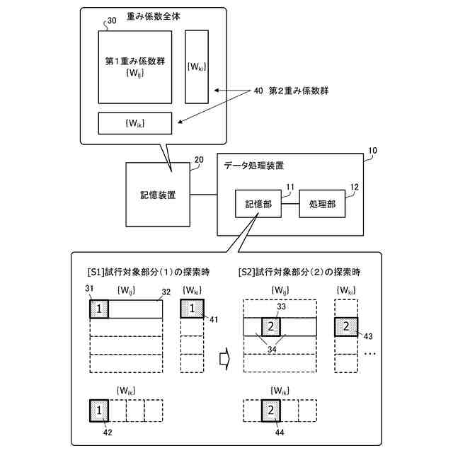 前記試行対象部分に属する前記第1状態変数の値の変化を許容するか否かを前記第1局所場に基づいて判定する第1処理と、前記第1状態変数の値の変化を許容すると判定した場合、前記記憶部に記憶される前記第1重み係数に基づいて前記第1局所場を更新し、前記記憶部に記憶される前記第2重み係数に基づいて前記第2局所場を更新し、更新前の前記第2局所場と更新後の前記第2局所場とに基づいて、前記複数の第1状態変数の各々に対応する前記第1局所場を更に更新する第2処理とを繰り返す探索処理を実行し、