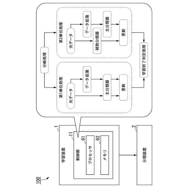 前記第1単位処理では、実行中の第1単位処理よりも前に実行された第1単位処理における主分類器の結果であって処理対象を元データとする主分類器の結果にも基づき、主分類器及び補助分類器が更新される、