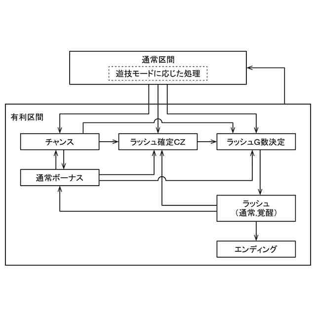 【解決手段】遊技区間としては、通常区間と、有利区間と、がある。有利区間は、チャンスモードと、ラッシュ確定CZモードと、ラッシュG数決定モードと、通常ボーナスモードと、ラッシュモードと、エンディングモードと、により構成されている。ラッシュ確定CZモードには、確定CZ抽選に当選した場合に移行し、ラッシュ確定CZモードに移行した場合には、ラッシュモードへの移行が確定する。ここで、確定CZ抽選に当選した場合には、通常区間を経てラッシュ確定CZモードに移行することがあり、かかる通常区間では、有利区間への移行抽選に当選したゲームでラッシュ確定CZモードにおける遊技モード処理を行う。通常区間からラッシュ確定CZモードには、内部中である場合に移行する。