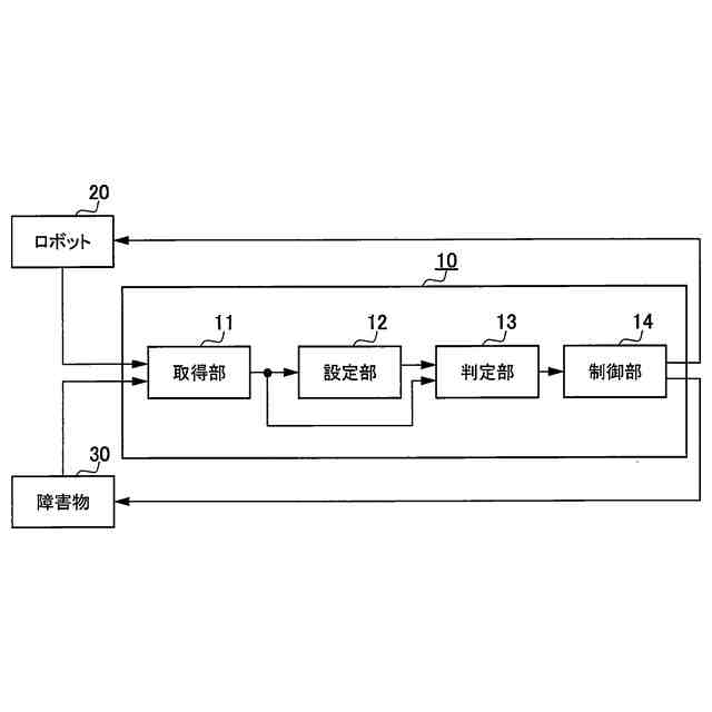 ロボット及び障害物に関する各情報を取得する取得部と、