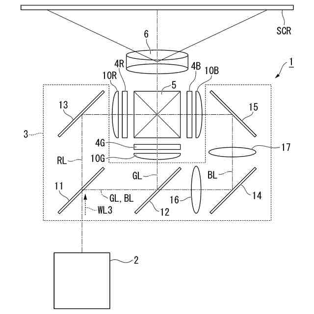 色分離光学系3は、照明光WL3を赤色照明光RLと、緑色照明光GLと、青色照明光BLと、に分離する。色分離光学系3は、例えば、第1ダイクロイックミラー11と、第2ダイクロイックミラー12と、第1反射ミラー13と、第2反射ミラー14と、第3反射ミラー15と、第1リレーレンズ16と、第2リレーレンズ17と、を備える。