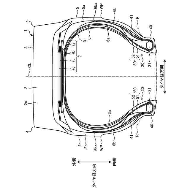 カーカスコードのウェーブに起因するカーカスコードの切れを抑えるには、ビード部にチェーファーを配置しないという手法が考えられるが、ビード部にチェーファーを配置しない場合、ビード部の剛性を確保し難くなる。車両の走行時には、駆動力や制動力によってビード部とリムホイールとの間で回転トルクが伝達されるが、ビード部にチェーファーを配置しないことによりビード部の剛性が低下した場合は、リムホイールに対するビード部の締め付け力が低下し易くなる。このように、リムホイールに対するビード部の締め付け力が低下した場合には、回転トルクが作用した際におけるビード部とリムホイールとの間での滑りであるリム滑りが発生し易くなる。このため、リム滑りを発生させることなくビード部の耐久性を向上させることは大変困難なものとなっていた。