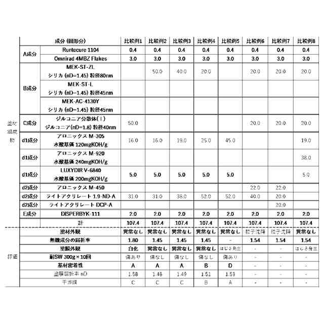 本発明者らは、上記課題を解決すべく鋭意研究した結果、屈折率の異なる2種の無機微粒子を用い、水酸基を有する(メタ)アクリレートと水酸基を有さない(メタ)アクリレートの2種を配合し、更に硬化後の屈折率(nD)を特定の範囲とすることで上記課題を解決できることを見出し、本発明を完成させた。