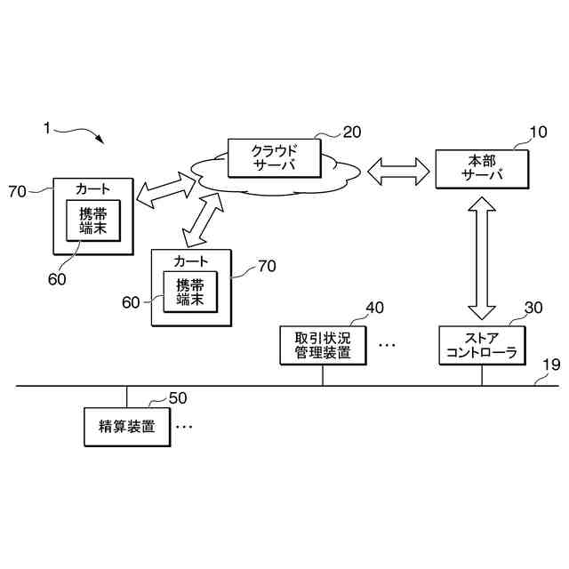 販売システム1は、種々の業態(スーパーマーケット、コンビニエンスストア、ドラッグストア、ホームセンタ、家電量販店等)に導入可能である。ストアコントローラ30、取引状況管理装置40、精算装置50は、店舗内(商品陳列エリア、会計エリア、バックヤード、事務所等)に設置される。これらは、LAN19(有線でも無線でもよい)を介して通信可能である。本部サーバ10及びクラウドサーバ20は、店舗外(例えば、本社やデータセンタ等)に設置される。店舗内に設置されている装置(ストアコントローラ30、取引状況管理装置40、精算装置50)と店舗外に設置されている装置(本部サーバ10、クラウドサーバ20)とは、通信(直接的に通信、又は、ストアコントローラ30を介して通信)可能である。
