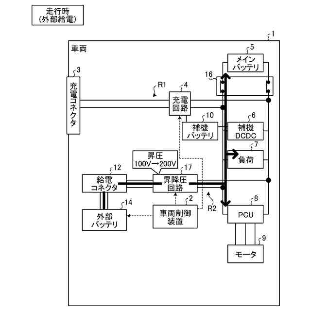 車外から前記第1コネクタを介した給電が行われる場合に、前記第1コネクタからの給電電圧が閾値以上である場合には、前記第1コネクタから前記第1経路および前記第2経路を介し前記昇降圧回路により前記給電電圧を降圧して前記第2コネクタへ給電する