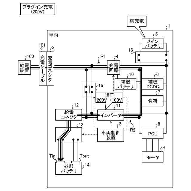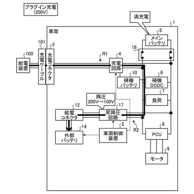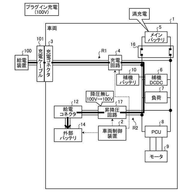 本発明によれば、第1コネクタからの給電電圧が閾値以上の高い電圧である場合に、変換装置を介して給電電圧を降圧することで、第2コネクタに供給される給電電圧を下げることができる。これにより、第2コネクタに接続された外部バッテリ等の電化製品の定格電圧と給電電圧との電圧差を小さくできるため、第1コネクタからの給電時における電化製品の劣化を低減することができる。