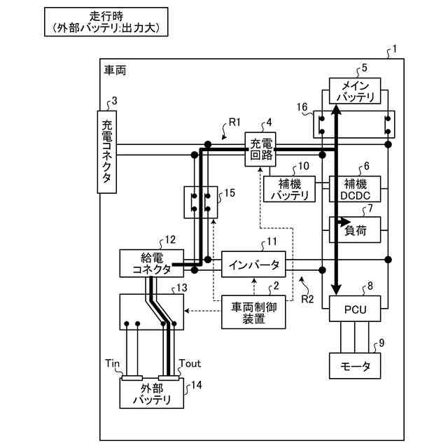 前記車両が走行中において、前記外部バッテリの出力電力が閾値以上の場合には、前記外部バッテリから出力される電力により前記メインバッテリの充電、または、前記メインバッテリの電力供給先への給電のいずれかを行う