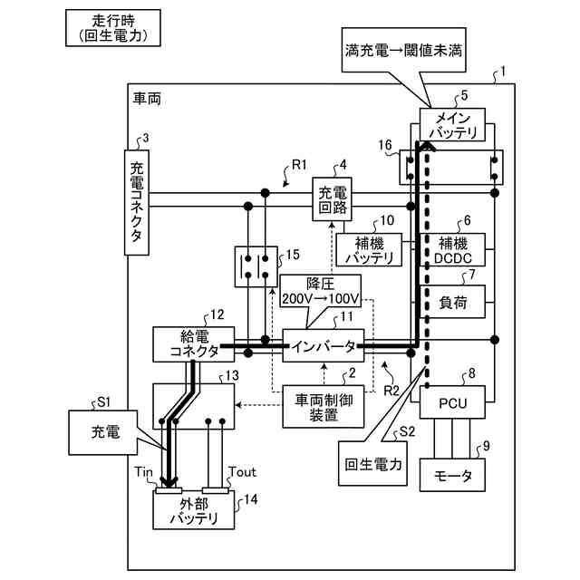前記車両が走行中において、前記メインバッテリの電池残量が閾値以上である場合には、前記メインバッテリから前記第2コネクタへ給電して前記電池残量を閾値未満まで低下させた後、前記回生電力を前記メインバッテリに充電する