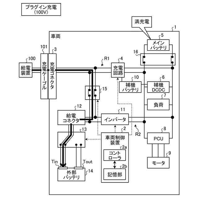 車外から車両に給電可能な第1コネクタからメインバッテリまでを接続する第1経路と、外部バッテリが着脱可能に接続された第2コネクタから昇降圧回路を介して前記メインバッテリまでを接続する第2経路とを備えた車両を制御するコントローラを備え、