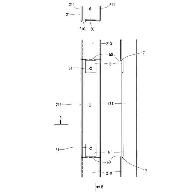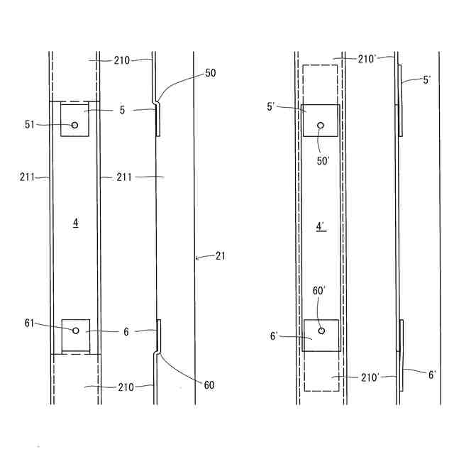 これに対して、図9左図に示すように、戸先側縦フレーム21の見込壁210から上側取付片5、下側取付片6を一体形成することで、螺子孔の位置出しを容易にすることが考えられる(図9左図は、従来例を示すものではない点に留意されたい)。このものでは、上側取付片5、下側取付片6の基端側部位を、見込壁210に対して内側に折り曲げる際に、上側取付片5、下側取付片6の両側に切り欠きを形成して曲げる(ランス加工)ことから、加工に伴う上側取付片5、下側取付片6の幅寸法の制限や折り曲げ部位(くびれ部)の伸びが原因で、錠前部に要求される強度を満たさないおそれがある。