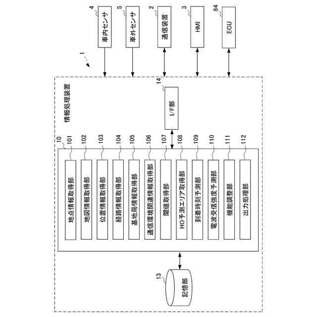 前記経路情報取得部、前記基地局情報取得部、前記閾値取得部、前記ハンドオーバ予測エリア取得部、前記到着時刻予測部、前記受信電波強度予測部、前記出力処理部を有する情報処理装置と、