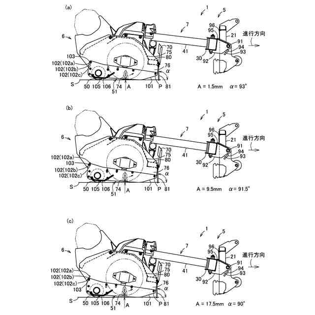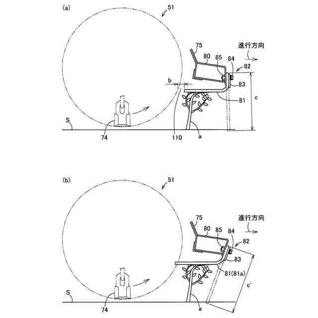 (a)ないし(c)はそれぞれ刈高さ寸法が異なる作業時の側面図である。