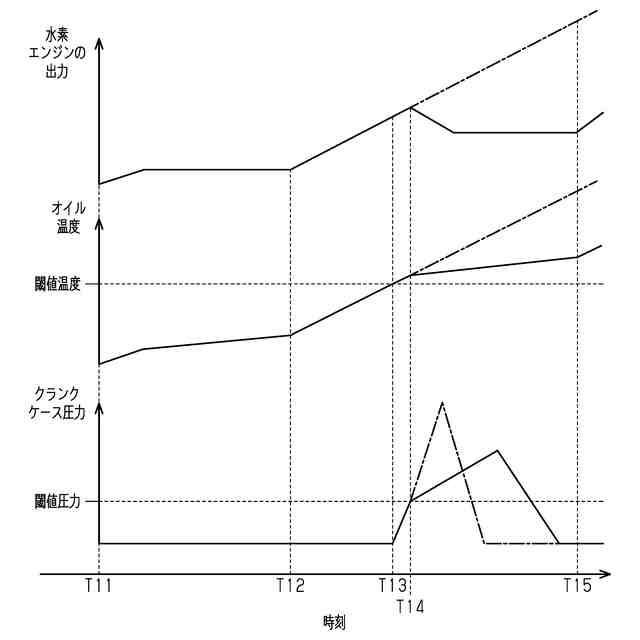 前記制御装置は、前記オイル温度が前記閾値温度を上回ってから一定の期間の間に、前記クランクケース圧力が閾値圧力を上回った場合に、前記水素エンジンの出力を前記既定期間にわたって制限し、