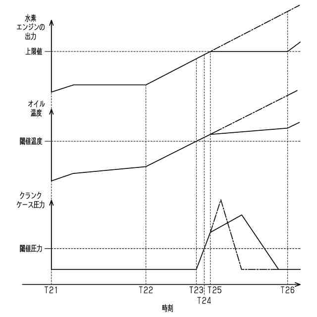 【解決手段】水素エンジンは、燃焼室からクランクケースに漏出したブローバイガスをクランクケースから吸気通路に還流させるブローバイガス通路を備える。クランクケースに貯留しているオイルに含まれる水分がクランクケースにおいて蒸発を開始する温度に基づいて閾値温度が予め設定されている。制御装置は、オイルの温度であるオイル温度が閾値温度を上回ったときから既定期間にわたって、水素エンジンの出力を制限する(S306~S310)。