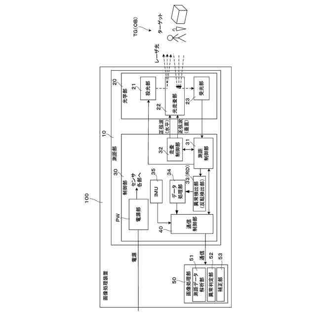 【解決手段】 距離画像装置100は、監視対象OBに向けて光を走査する光走査部22と、光走査部22による走査光の反射光を受光する受光部23と、光走査部22による光走査と受光部23での受光結果とに基づく測距画像について、測距画像のうち判定対象画素JPにおける異常の有無を、判定対象画素の距離値と判定対象画素に隣接する隣接画素の距離値との対比に基づいて判定する異常判定部52とを備える。