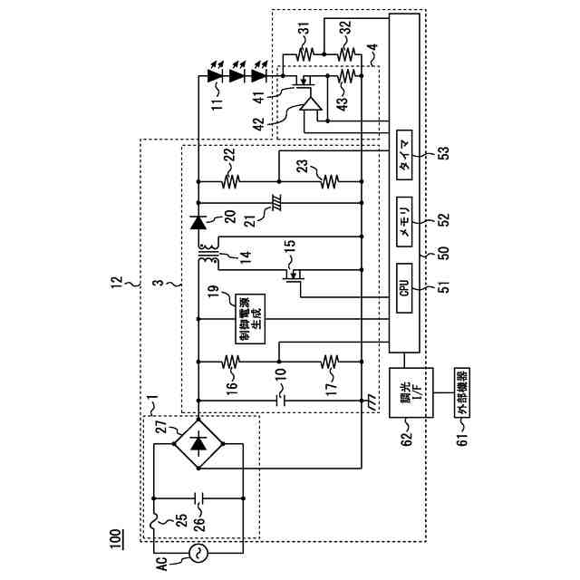 近年、照明装置の光源には、LEDが使用されることが一般的である。LEDは白熱電球または蛍光灯に比べて、明るさが電圧変化に追従しやすいことが知られている。つまり、照明装置のリップルを低減しないと、光がちらついて見えてしまう可能性が高い。このため、商用電源を一度昇圧してリップルを低減し、その後段でLED光源に適した電圧に降圧するというような2コンバータ方式を採用している電源が多い。