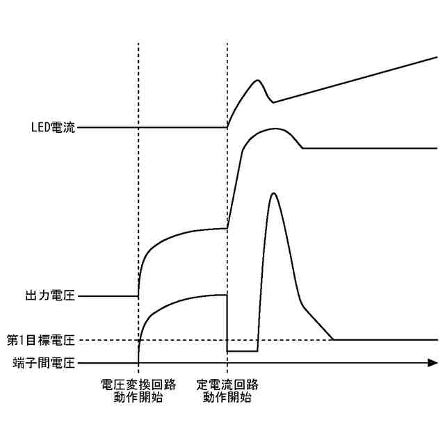 一方、照明装置では、高調波の規定または高力率によるメリットの観点から、コンバータをPFC(Power Factor Correction)動作させて力率改善を行う場合が多い。コンバータをPFC動作させるためには、コンバータの応答を十分に遅くする必要がある。このように応答を遅くした場合には特に、定電流回路の起動タイミングでコンバータの出力電圧が安定していないことにより、LEDがフラッシュするように見えてしまうおそれがあった。