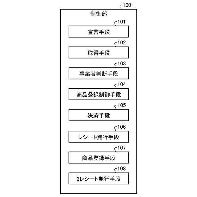 前記事業者判断手段が判断した事業者の商品が前記宣言した事業者の商品でない場合に、当該商品について商品登録処理を実行し、前記事業者判断手段が判断した事業者の商品が前記宣言した事業者の商品の場合に、当該商品について商品登録処理を実行しない、商品登録制御手段と、