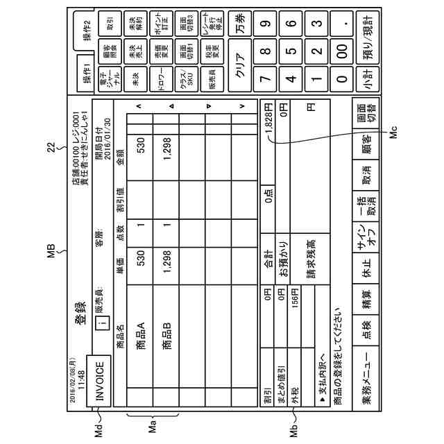 決済処理とは、商品登録処理に伴いRAM等に記憶された商品情報に基づいて、当該取引に係る合計金額の表示、顧客からの預り金に基づいて釣銭を計算して表示する処理、釣銭の発行を釣銭機に指示する処理等をいう。またPOS端末1は、決済処理した商品の商品情報や決済情報(合計金額、預り金額、釣銭額等)を印字したレシートを発行する処理を行う。なお、一人の顧客に対する商品登録処理の開始から決済処理の終了までを一取引という。