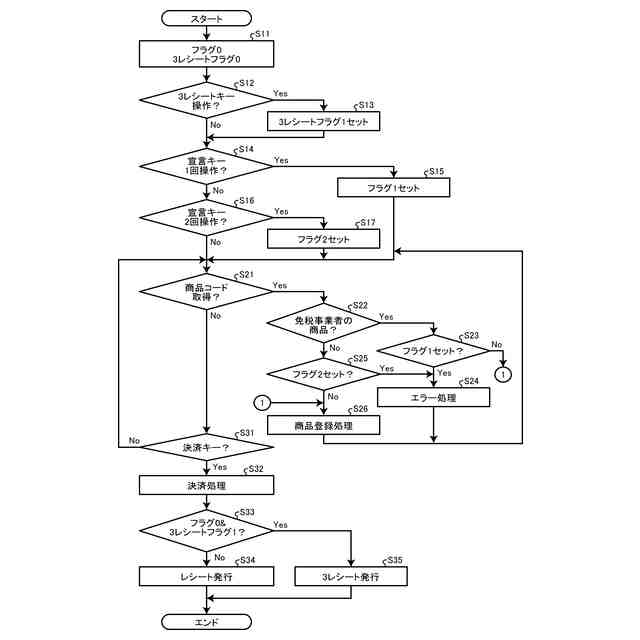 商品ごとに、前記課税事業者の商品か前記免税事業者の商品かの事業者情報を記憶する記憶部を参照して、前記決済処理した商品に係るレシートと、前記決済処理した前記課税事業者の商品に係るレシートと、前記決済処理した前記免税事業者の商品に係るレシートと、をそれぞれ印字して発行する3レシート発行手段と、