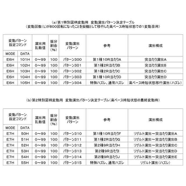 第1~第6実施形態の遊技機1の普通図柄決定テーブルおよび普通図柄の変動パターン決定テーブルである。