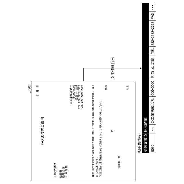 ファクスデータに含まれている画像データから、相手先に関する第1の相手先情報を抽出する文字情報抽出機能部と、