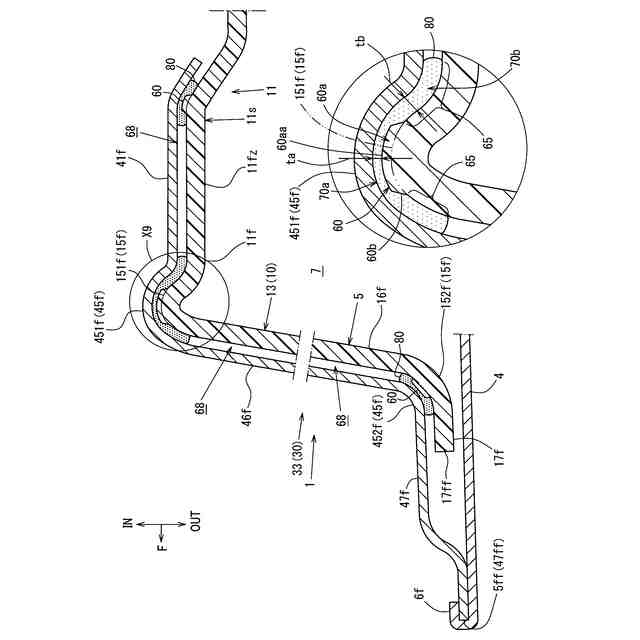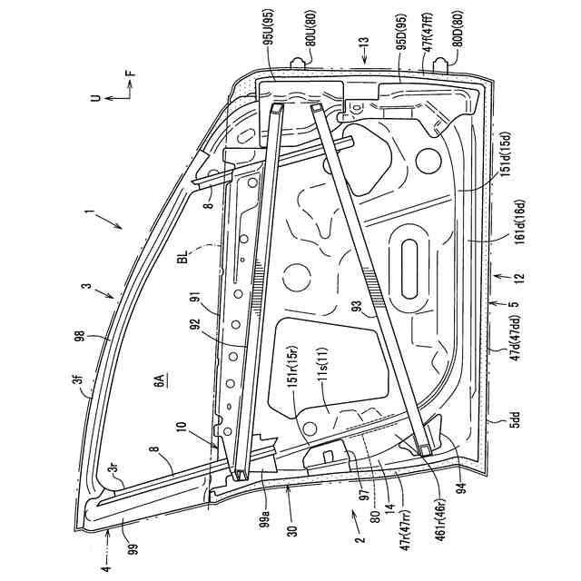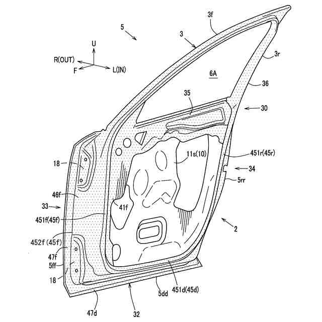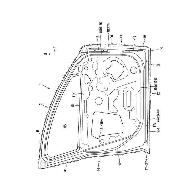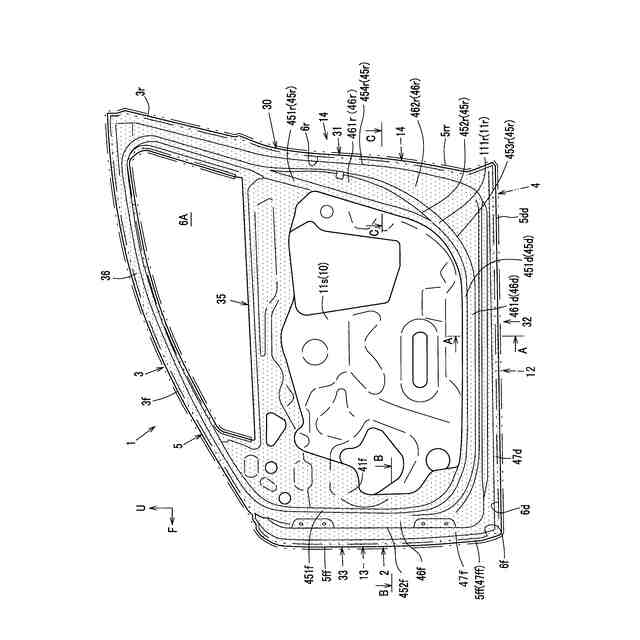 【解決手段】ドアアウタパネル4と、樹脂製のドアインナパネル10と、ドアインナパネル10と異なる材質で形成される補強部材30と、両部材10,30を接合する接着剤80と、を備え、ドアインナパネル10は、ドアアウタパネル4から幅方向内側に離間して配置される内面部11および、内面部11の端部から稜線部15を介して車幅方向に延びる壁部16を備え、補強部材30は、ドアインナパネル10における壁部161と稜線部15とに対して車幅方向において対向し、接着剤80は、稜線部15と、その周辺領域65とに備えるとともに、稜線部15における厚みtaが、稜線部15の周辺領域65における厚みtbより薄くなるように設けられた。