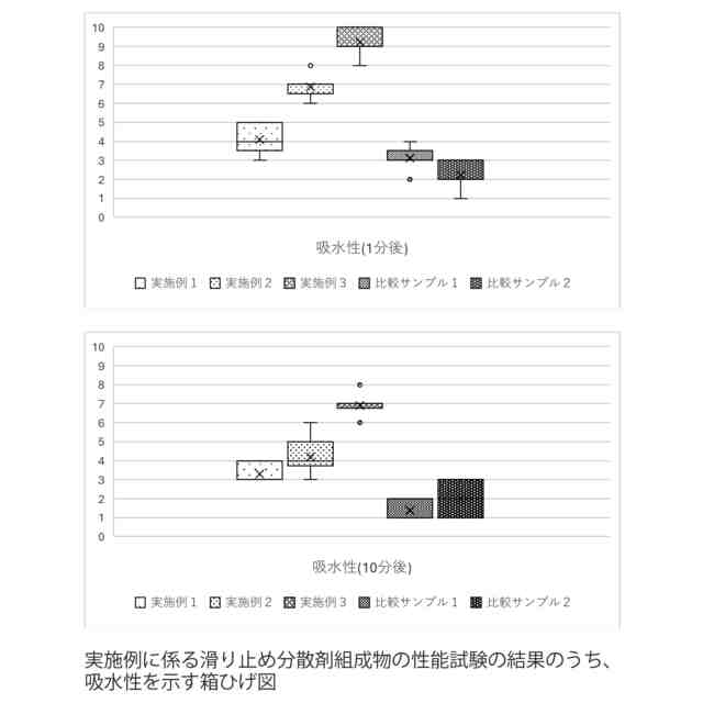 吸湿性粉体と、糖類と、を含む、液状又はペースト状の滑り止め分散剤組成物。