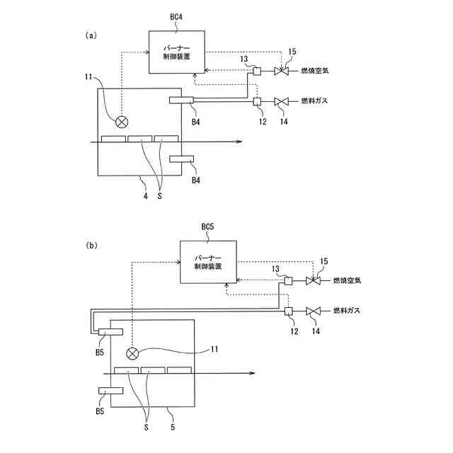 この連続式加熱炉では、各燃焼帯において、バーナーの最適な燃焼を維持するために、バーナーへの燃料ガス流量及び燃焼空気流量の比率を用いて、バーナーに供給する燃料ガス流量及び燃焼空気流量の制御を行う。