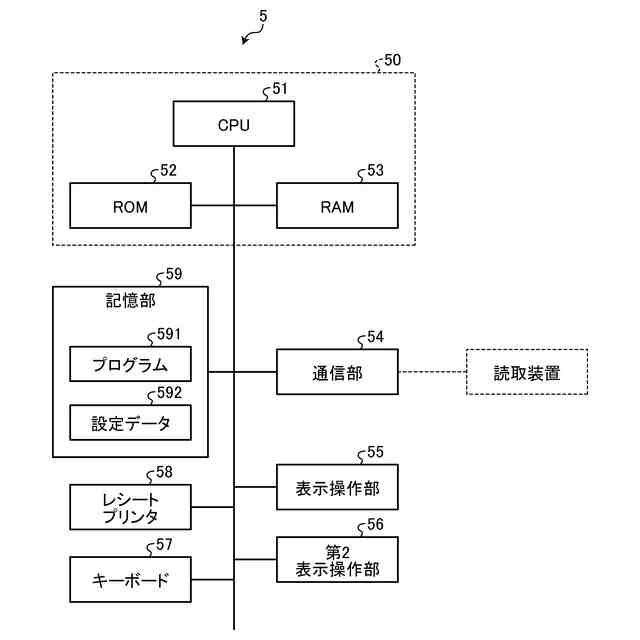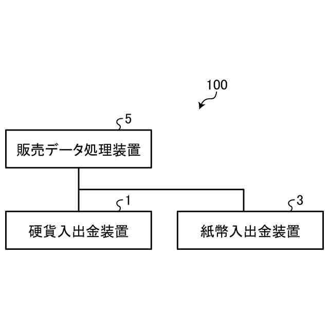 図1は、本実施形態に係る販売データ処理システム100の一例を示す図である。販売データ処理システム100は、入出金装置1,3(硬貨入出金装置1、紙幣入出金装置3)および販売データ処理装置5を含む。販売データ処理装置5は、例えば、据え置き型のPOS端末装置であってもよいし、スマートフォンやタブレット端末等の携帯可能な情報処理装置で実現される販売データ処理装置であってもよい。なお、「POS」は「Point Of Sale」の略称であって、「販売時点情報管理」を意味する。販売データ処理装置5は、販売時点情報管理を行う装置である。
