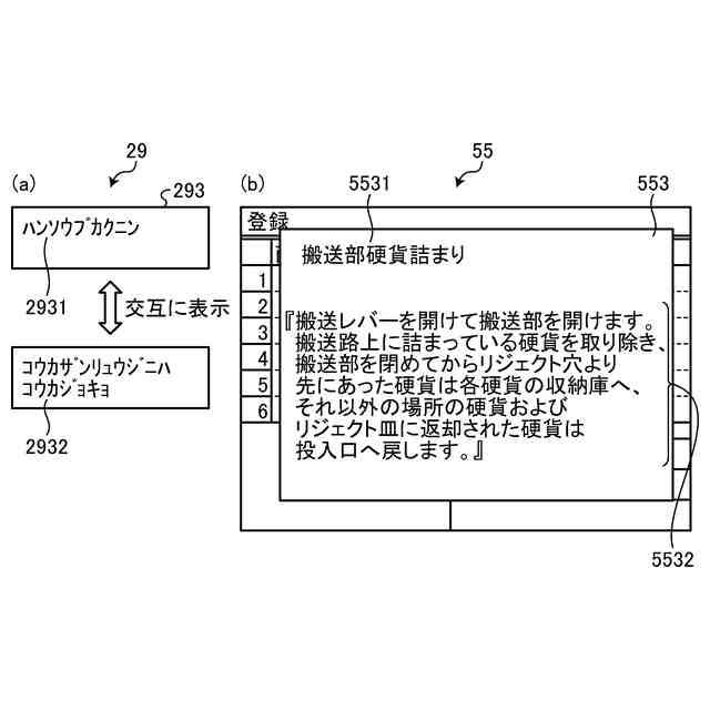 入出金装置は、装置の状態を使用者(操作者、店員)に伝えるための表示部を備えている。この表示部には、安価で小型のものが採用されることが多く、このため、表示できる文字の種類や文字数に制限があることが多い。したがって、従来の入出金装置の表示部は、エラー発生時等に対処手順を詳細に説明する用途には適していない。